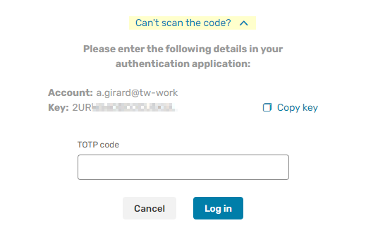Enter this code in the TOTP Code field on the login page of your workspace, then click Log in.