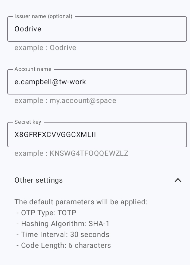 You can add your Oodrive account to Oodrive Authenticator by scanning the QR code on the login page or by manually entering the account name and the secret key associated with it.