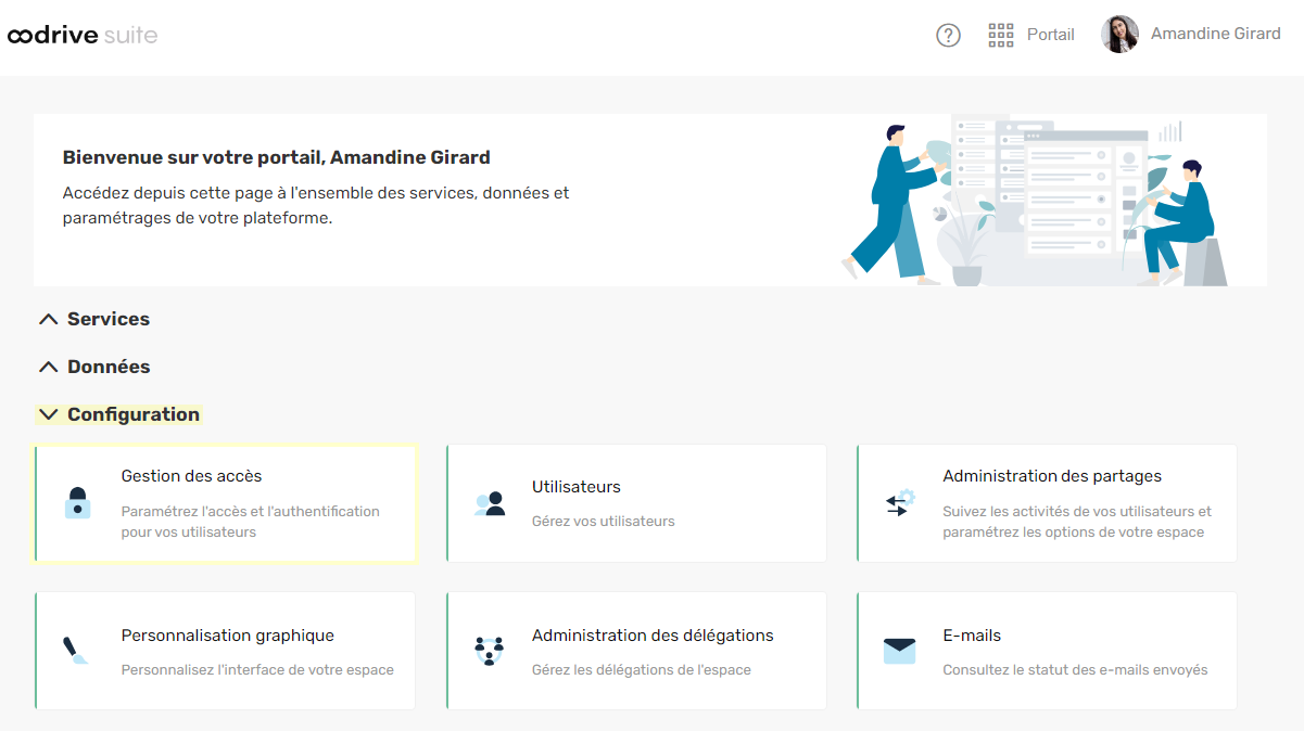 Plusieurs modules d'administration peuvent être à votre disposition dans le portail de la suite Oodrive, en fonction de la répartition de ces responsabilités au sein de votre société.