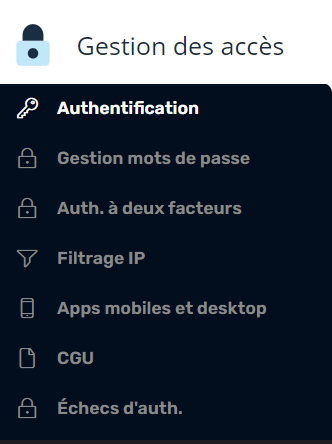 Accédez rapidement à l’ensemble des rubriques du module de gestion des accès depuis le panneau de navigation situé sur le côté gauche de la page.