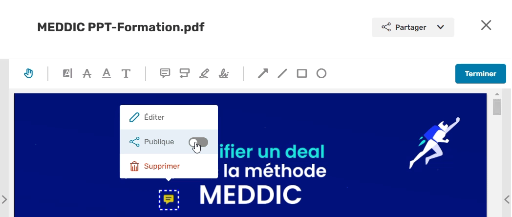 Si vous souhaitez partager une annotation avec vos collaborateurs, sélectionnez la et activez l'option Publique.