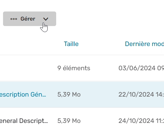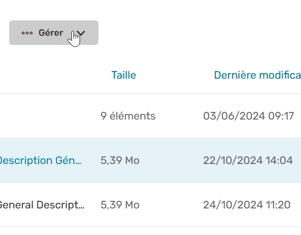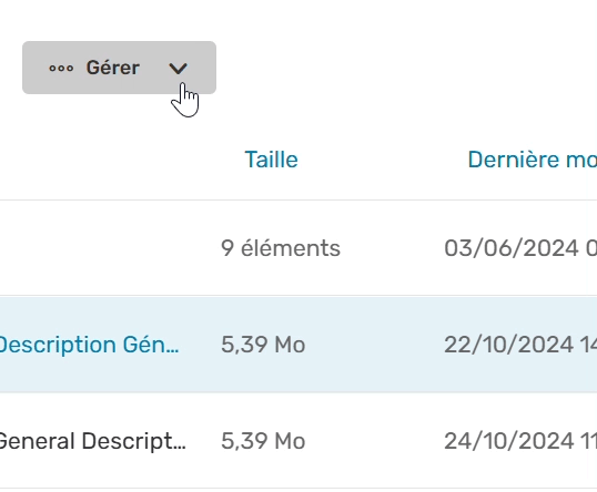 Pour cela, sélectionnez un élément, cliquez sur le bouton Gérer dans la barre en haut de la page, puis sélectionnez l'action à effectuer :
