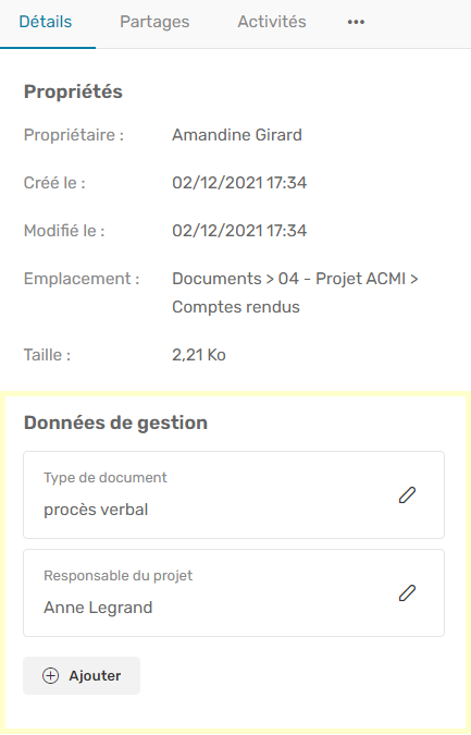 Dans l’onglet Détails du panneau d’informations, placez-vous dans la section Données de gestion et cliquez sur le bouton Ajouter.