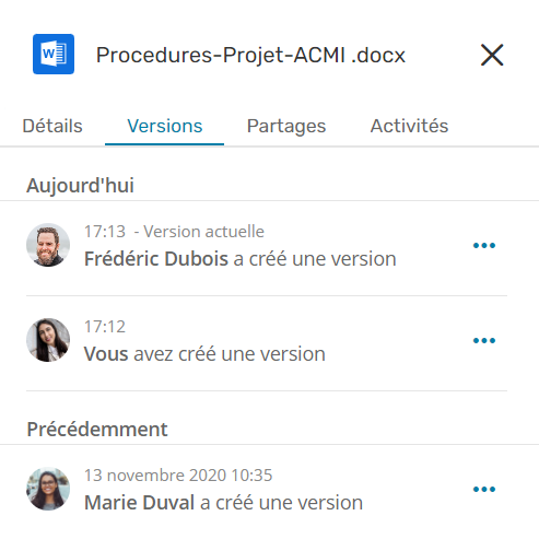 Vous voyez l'historique des versions générées pour votre fichier, avec la date et la personne responsable des modifications.